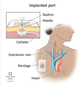 Il port, costituito da materiale biocompatibile, solitamente silicone, viene inserito sottocute con intervento chirurgico in anestesia locale e può rimanere sul posto settimane, ma anche mesi o anni, a seconda delle esigenze. È estremamente utile per le persone immunocompromesse che ricevono trattamenti oncologici, ed evita punture frequesnti riducendo sensazioni di disagio e dolori.